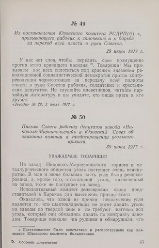 Из постановления Юзовского комитета РСДРП(б), призывающего рабочих к сплочению и к борьбе за переход всей власти в руки Советов. 29 июня 1917 г.