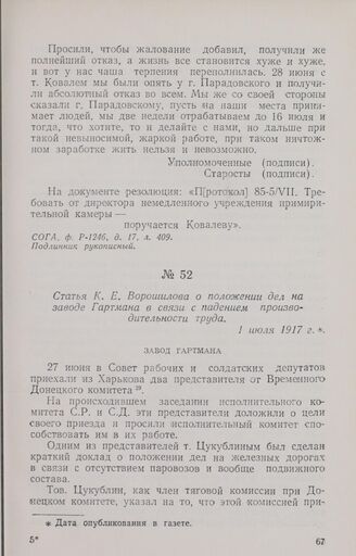 Статья К. Е. Ворошилова о положении дел на заводе Гартмана в связи с падением производительности труда. 1 июля 1917 г.