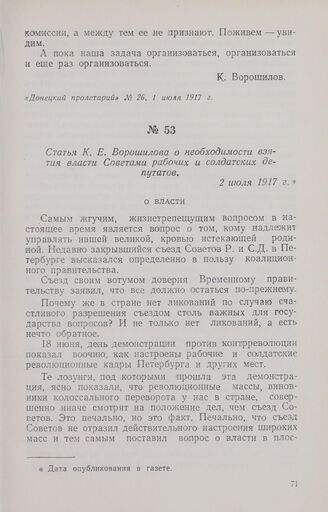 Статья К. Е. Ворошилова о необходимости взятия власти Советами рабочих и солдатских депутатов. 2 июля 1917 г. // «Донецкий пролетарий» № 27, 2 июля 1917 г.