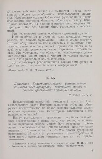 Донесение Екатеринославского епархиального комитета обер-прокурору святейшего синода о захвате крестьянами церковных земель. 15 июля 1917 г. // ЦГАОР СССР, ф. 406, oп. 2, д. 628, л. 144. Копия. «Подготовка Великой Октябрьской социалистической революции на Украине», К., 1955, стр. 514.