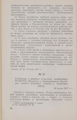 Сообщение о решении областной конференции РСДРП(б) Донецкого и Криворожского бассейнов создать областной комитет и областную газету. 18 июля 1917 г. // «Звезда» № 42, 18 июля 1917 г.