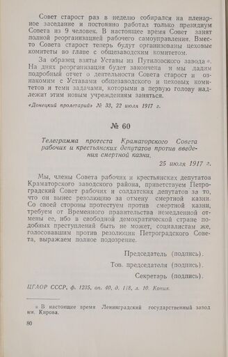 Телеграмма протеста Краматорского Совета рабочих и крестьянских депутатов против введения смертной казни. 25 июля 1917 г.