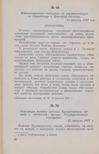 Информационное сообщение об увеличивающейся безработице в Донецком бассейне. 11 августа 1917 г. // «Донецкий пролетарий» № 50, 11 августа 1917 г.