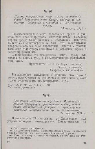Письмо профессионального союза паровозных бригад Мариупольскому Совету рабочих и солдатских депутатов с просьбой о регистрации союза. 26 августа 1917 г. // СОГА, ф. Р-1246, oп. 1, д. 1, л. 252. Подлинник рукописный.