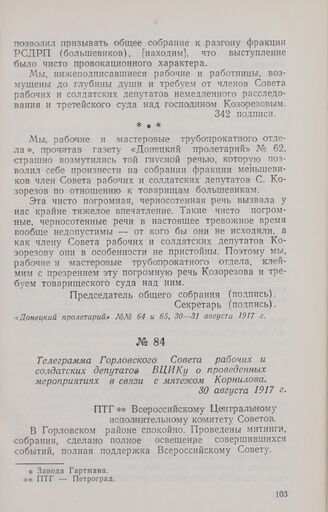 Телеграмма Горловского Совета рабочих и солдатских депутатов ВЦИКу о проведенных мероприятиях в связи с мятежом Корнилова. 30 августа 1917 г.
