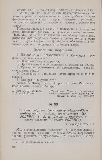 Решение собрания большевиков Макеево-Юзово-Петровского района приветствовать ЦК РСДРП(б) и В. И. Ленина и проводить в жизнь указания VI съезда РСДРП(б). 1 сентября 1917 г. // «Звезда» № 79, 1 сентября 1917 г.