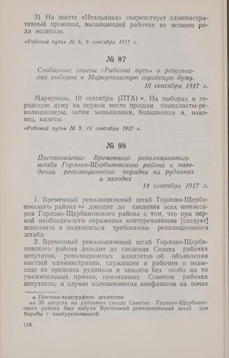 Постановление Временного революционного штаба Горлово-Щербиновского района о наведении революционного порядка на рудниках и заводах. 14 сентября 1917 г. // ЦГАОР СССР, ф. 406, oп. 2, д. 81, л. 227. Копия. «Подготовка Великой Октябрьской социалистической революции на Украине», К., 1955, стр. 720—721.