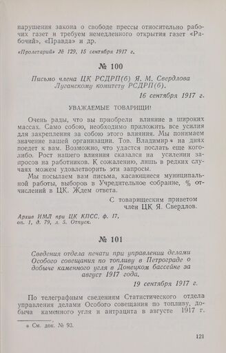 Письмо члена ЦК РСДРП(б) Я. М. Свердлова Луганскому комитету РСДРП(б). 16 сентября 1917 г. // Архив ИМЛ при ЦК КПСС, ф. 17, oп. 1, д. 79, л. 5. Отпуск.