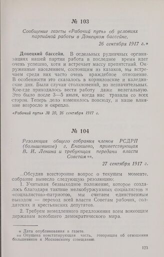 Резолюция общего собрания членов РСДРП (большевиков) г. Енакиево, приветствующая В. И. Ленина и требующая передачи власти Советам. 27 сентября 1917 г.