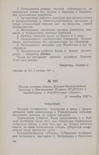 Письмо пленума обкома Донецко-Криворожского бассейна в Центральный Комитет РСДРП(б) о кандидатурах в Учредительное собрание. 27 сентября 1917 г.