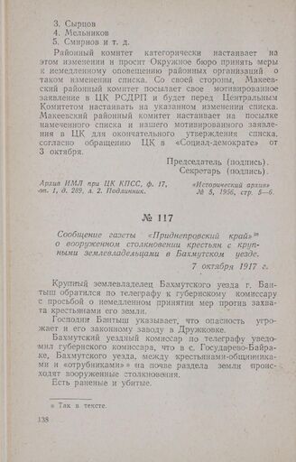 Сообщение газеты «Приднепровский край» о вооруженном столкновении крестьян с крупными землевладельцами в Бахмутском уезде. 7 октября 1917 г. // «Приднепровский край» № 6305, 7 октября 1917 г.