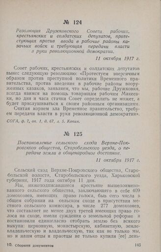 Постановление сельского схода Верхне-Покровского общества, Старобельского уезда, о передаче земли в общенародное достояние. 11 октября 1917 г. // ЦГАОР УССР, ф. 535, д. 2, л. 22. Копия. «Подготовка Великой Октябрьской социалистической революции на Украине», К., 1955, стр. 735.