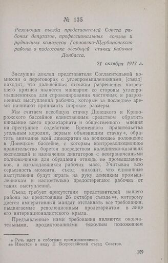 Резолюция съезда представителей Совета рабочих депутатов, профессиональных союзов и рудничных комитетов Горловско-Щербиновского района о подготовке всеобщей стачки рабочих Донбасса. 21 октября 1917 г. // СОГА, ф. Р-2627, oп. 1, д. 1, л. 1. Подлинник. «Подготовка Великой Октябрьской социалистической революции на Украине», К., 1955, стр. 740—741.