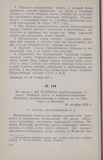 Из писем в ЦК РСДРП(б), опубликованных в газете «Рабочий путь», о контрреволюционных действиях промышленников и казаков на ст. Сартана и в Макеевке. 26 октября 1917 г.