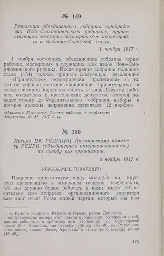 Резолюция объединенного собрания горнорабочих Ново-Смоляниновского рудника, приветствующая восстание петроградского пролетариата и создание Советской власти. 1 ноября 1917 г. // «Известия Юзовского Совета рабочих и солдатских депутатов» № 47, 1917 г.
