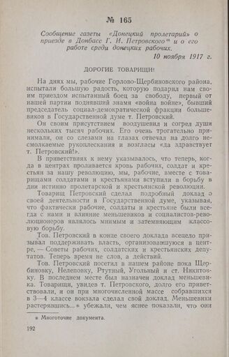 Сообщение газеты «Донецкий пролетарий» о приезде в Донбасс Г. И. Петровского и о его работе среди донецких рабочих. 10 ноября 1917 г. // «Донецкий пролетарий» (Харьков) № 8, 10 ноября 1917 г.