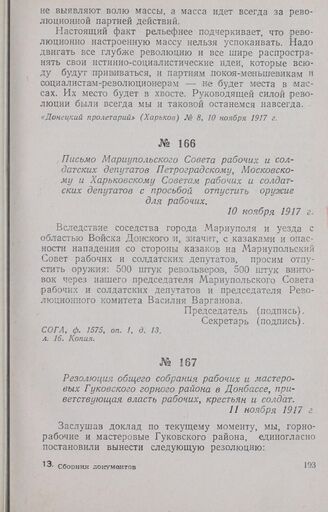 Письмо Мариупольского Совета рабочих и солдатских депутатов Петроградскому, Московскому и Харьковскому Советам рабочих и солдатских депутатов с просьбой отпустить оружие для рабочих. 10 ноября 1917 г.