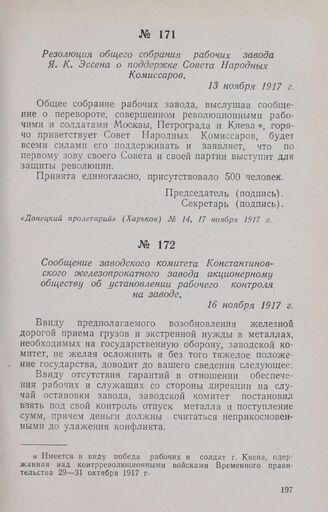 Сообщение заводского комитета Константиновского железопрокатного завода акционерному обществу об установлении рабочего контроля на заводе. 16 ноября 1917 г. // ВОГА, ф. Р-65, д. 28, л. 140. Копия. «Победа Великой Октябрьской социалистической революции и установление Советской власти на Украине», К., 1951, стр. 286—287.