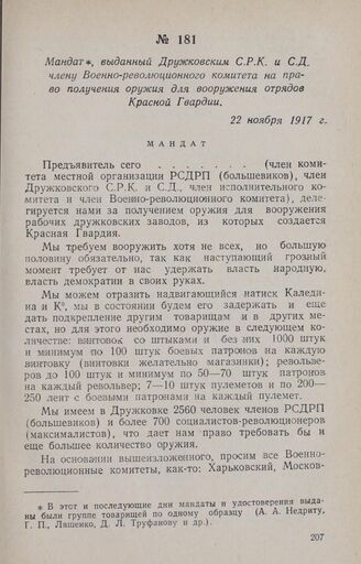 Мандат, выданный Дружковским С.Р.К. и С.Д. члену Военно-революционного комитета на право получения оружия для вооружения отрядов Красной Гвардии. 22 ноября 1917 г. // СОГА, ф. Р-2620, д. 6, лл. 269—270. Подлинник. «Победа Великой Октябрьской социалистической революции и установление Советской власти на Украине». К., 1951, стр. 300.
