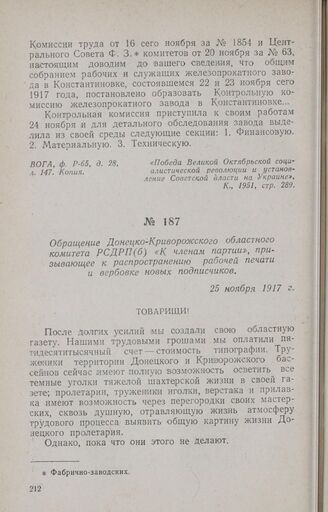 Обращение Донецко-Криворожского областного комитета РСДРП(б) «К членам партии», призывающее к распространению рабочей печати и вербовке новых подписчиков. 25 ноября 1917 г. // «Донецкий пролетарий» (Харьков) № 20, 25 ноября 1917 г.