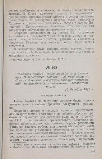 Резолюции общего собрания рабочих и служащих Вознесенского рудника об отношении к Советской власти, о введении рабочего контроля над производством и повышении заработной платы. 10 декабря 1917 г. // «Донецкий пролетарий» (Харьков) № 38, 17 декабря 1917 г.