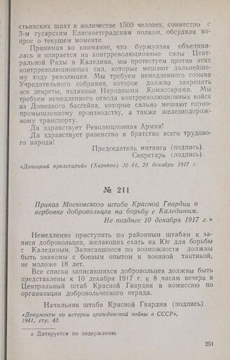 Приказ Московского штаба Красной Гвардии о вербовке добровольцев на борьбу с Калединым. Не позднее 10 декабря 1917 г. // «Документы по истории гражданской войны в СССР», 1941, стр. 43.