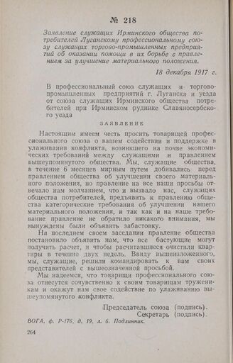Заявление служащих Ирминского общества потребителей Луганскому профессиональному союзу служащих торгово-промышленных предприятий об оказании помощи в их борьбе с правлением за улучшение материального положения. 18 декабря 1917 г. // ВОГА, ф. Р-176, д. 19, л. 6. Подлинник.