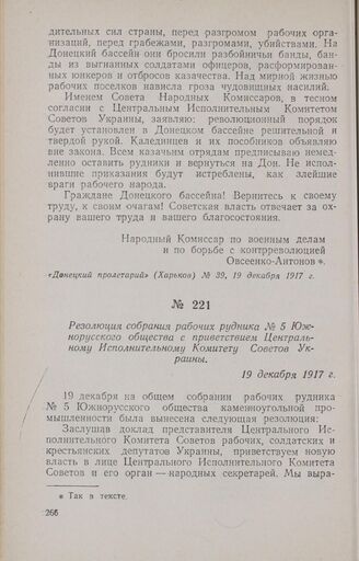 Резолюция собрания рабочих рудника № 5 Южнорусского общества с приветствием Центральному Исполнительному Комитету Советов Украины. 19 декабря 1917 г. // «Вестник Украинской Народной Республики» № 4, 5 января 1918 г.