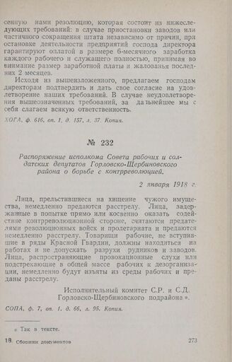 Распоряжение исполкома Совета рабочих и солдатских депутатов Горловско-Щербиновского района о борьбе с контрреволюцией. 2 января 1918 г. // СОПА, ф. 7, oп. 1. д. 66, л. 95. Копия.