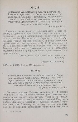 Обращение Дружковского Совета рабочих, солдатских и крестьянских депутатов ко всем Военно-революционным комитетам, комендантам станций с просьбой оказывать содействие представителям Дружковского Торецкого завода в отпуске и погрузке угля. 8 января...