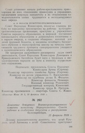 Донесение дежурного Военно-революционного комитета исполкому Мариупольского Совета рабочих и солдатских депутатов о разоружении белогвардейцев. 15 февраля 1918 г. // СОГА, ф. Р-1246, oп. 1, д. 6, л. 176. Подлинник рукописный