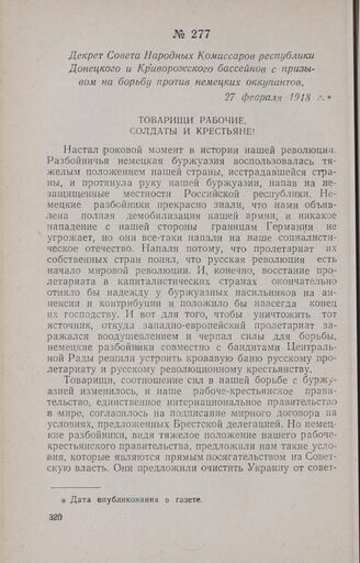 Декрет Совета Народных Комиссаров республики Донецкого и Криворожского бассейнов с призывом на борьбу против немецких оккупантов. 27 февраля 1918 г. // ЦГАОР УССР, ф. 1822, oп. 1, д. 1, лл. 2—3. Копия.