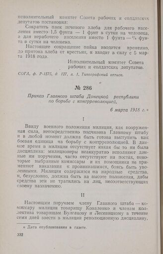 Приказ Главного штаба Донецкой республики по борьбе с контрреволюцией. 6 марта 1918 г. // «Донецкий пролетарий» (Харьков) № 88, 6 марта 1918 г.