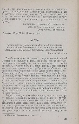 Распоряжение Совнаркома Донецкой республики всем органам Советской власти на местах о прекращении самочинных реквизиций продовольствия. 15 марта 1918 г.