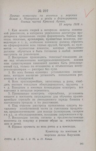 Приказ комиссара по военным и морским делам г. Мариуполя и уезда о формировании боевых частей Красной Армии. 18 марта 1918 г. // СОПА, ф. 7, oп. 1, д. 70, л. 11. Копия.