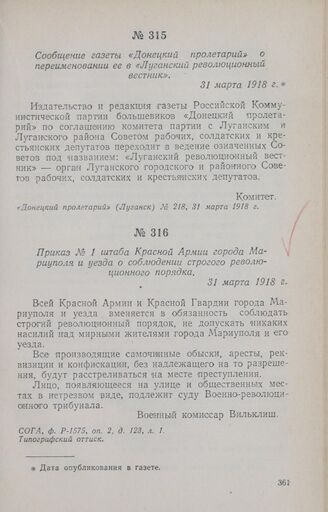 Приказ № 1 штаба Красной Армии города Мариуполя и уезда о соблюдении строгого революционного порядка. 31 марта 1918 г. // СОГА, ф. Р-1575, oп. 2, д. 123, л. 1. Типографский оттиск.