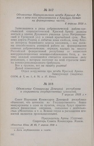 Объявление Мариупольского штаба Красной Армии о явке всех записавшихся в Красную Армию на формирование частей. 6 апреля 1918 г. // СОПА, ф. 7, oп. 1, д. 70, л. 17. Копия.