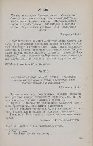 Письмо исполкома Мариупольского Совета рабочих и крестьянских депутатов в распорядительный комитет Союза моряков Мариупольского порта о предоставлении транспорта в распоряжение Бердянского ревкома для эвакуации хлеба. 7 апреля 1918 г. // СОПА, ф. 7, oп. 1, д. 70, л. 27. Копия.