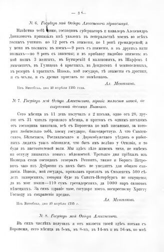 Письма князя Меншикова к адмиралу Федору Алексеевичу Головину 1705 и 1706 г.г. Государь мой Федор Алексеевич. Из Витебска, 20 апреля 1705 г.