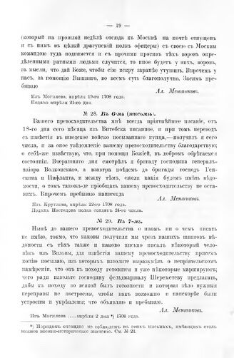 Письма князя Меншикова к канцлеру графу Гавриилу Ивановичу Головину 1708 - 1716 гг. В 7-м. Из Могилева, апреля 2 дня 1708 года // Москов. Главный архив министерства иностранных дел. Связка 9; № 47.