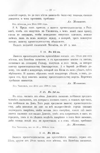 Письма князя Меншикова к канцлеру графу Гавриилу Ивановичу Головину 1708 - 1716 гг. В 25-м. Из Чашников, мая 29-го дня 1708 г. // Москов. Главный архив министерства иностранных дел. Связка 9; № 47.