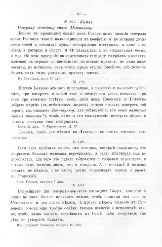 Копии с писем Государя Петра I к князю Меншикову 1707 - 1711 гг. Указ. Генералу господину князю Меншикову. В Горках, июля 16 дня 1708 года // Москов. Главный архив министерства иностранных дел. Связка 1; № 2.