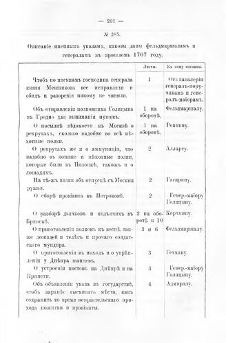 Списано с именных указов, каковы даны с начала прошлого года, будучи в Польше, генералам и прочим, за приписанием рукой Царского Величества, о военных делах. Опись указам, каковы даны фельдмаршалам и генералам. 1707 г.