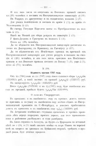 Росписи, выписки, описи, ведомости, указы, рапорты, журналы. О деньгах, соли, работниках, рекрутах. 1707 г.