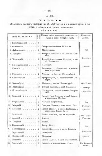 Росписи, выписки, описи, ведомости, указы, рапорты, журналы. а) Табель пехотным полкам, которые ныне обретаются в полевой армии и в Ингрии, и отколь им дается жалованье. б) Ведомость, что в кавалерии полков, и кто во оных командиры, и откуда на те...