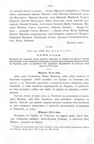 Росписи, выписки, описи, ведомости, указы, рапорты, журналы. Выписка из журнала, какое действо чинилось в марше от Гродно войск российских под командой господина генерал-фельдмаршала фон Огильви на Украйну, даже до прибытия Его Царского Величества в том же году июня в 27-й день. 1706 г. // Госуд. Арх.; Кабин. дела, отд. I, кн. 17, л. 147. Устрялов. История Царств. Петра В., т. IV, ч. II, стр. 409.