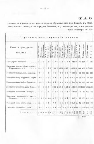 Табель. Сколько в 9-ти пехотных полках, обретающихся в обозе при Вильне, офицеров, урядников и солдат на лицо, и т. д. 20 сентября 1707 г.