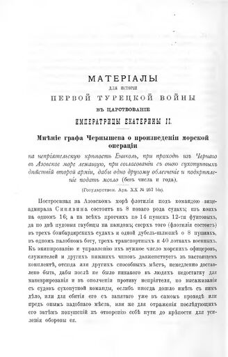 Материалы для истории первой турецкой войны в царствование Императрицы Екатерины II. Мнение графа Чернышева о произведении морской операции