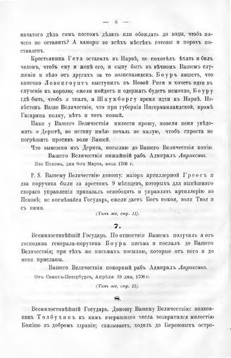 Письма адмирала Апраксина к Государю Петру I. От Санкт-Петербурга, апреля 19 дня, 1708 г. // Каб. дела, Отд. II, кн. 7, стр. 13.