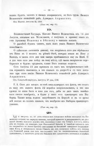 Письма адмирала Апраксина к Государю Петру I. От Санкт-Петербурга, Августа 27 дня, 1708 г. // Каб. дела, Отд. II, кн. 7, стр. 62.